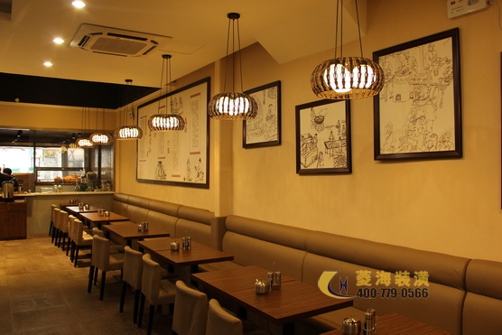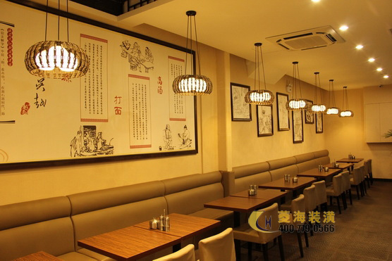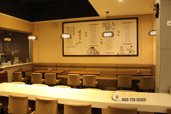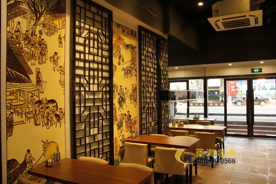 ????????越面閣的立面設(shè)計(jì)充分展示了百年前諸暨當(dāng)?shù)氐娜宋娘L(fēng)光,石板路、古纖道?、或牽牛或騎馬或三兩小兒作伴游于集市中……一幅幅生動(dòng)鮮活的壁畫(huà)娓娓?道出了故里風(fēng)情和淡雅的水鄉(xiāng)風(fēng)韻,與古越文化相融。另一面墻上則是同樣?以水墨手法展示的制面過(guò)程,描述了越面的起源,喚起食客們對(duì)料理的興趣?。越面閣的房型相對(duì)簡(jiǎn)單,無(wú)需多做隔斷,設(shè)計(jì)師在靠墻兩面設(shè)置四人卡座?,中間則擺放上吧臺(tái)形式的長(zhǎng)條桌,適合二人入座,既起到了布局上的分隔?也充分利用了店面空間。復(fù)古美觀的吊燈,前衛(wèi)時(shí)尚的掛鐘都是令人眼前一亮的設(shè)計(jì)元素。