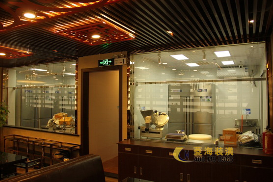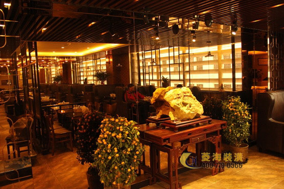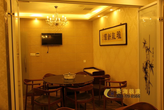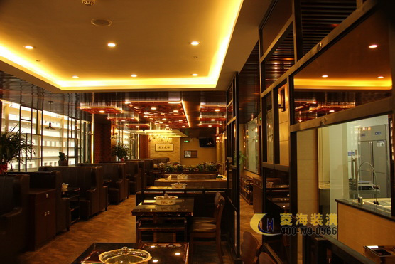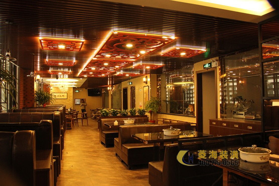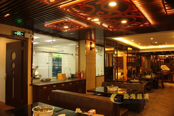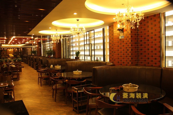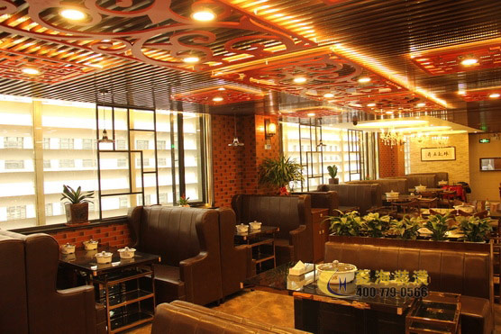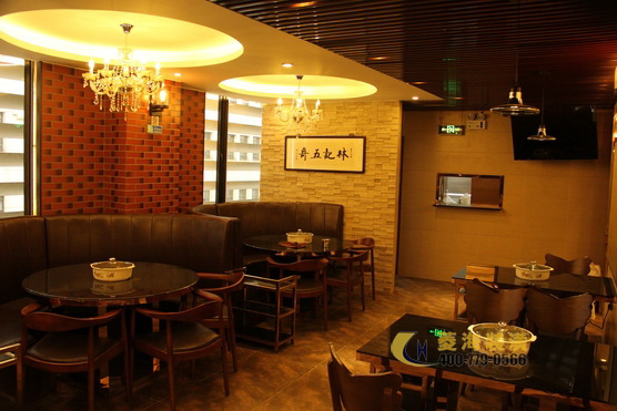 ????????考慮到潮州飲食不僅菜式豐富多樣而且注重養(yǎng)生的特點(diǎn),設(shè)計(jì)師特意在玄關(guān)處加入了一角翠竹假山的裝飾,搭配色彩濃厚鮮明的抽象壁畫以及用作點(diǎn)綴的綠色盆栽,立刻使整個(gè)餐廳脫離了火鍋店的油膩感,多了一份靜謐的雅致感。出于對(duì)家鄉(xiāng)文化的熱愛,林先生也相當(dāng)注重餐廳設(shè)計(jì)中所詮釋的潮汕文化氛圍,因此設(shè)計(jì)師將店面整體以穩(wěn)重的實(shí)木色調(diào)為主,頂部用上了復(fù)古圖騰花紋的壁燈,一側(cè)墻面用以紅磚墻裝飾,另一側(cè)則做為明廚,吧臺(tái)附近以及包間內(nèi)的墻面則掛上了幾幅筆力蒼勁的墨寶作品,整個(gè)餐廳簡(jiǎn)約穩(wěn)重更不失對(duì)潮汕文化的懷舊情感。