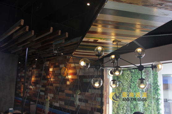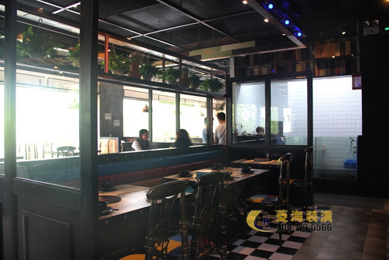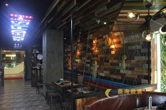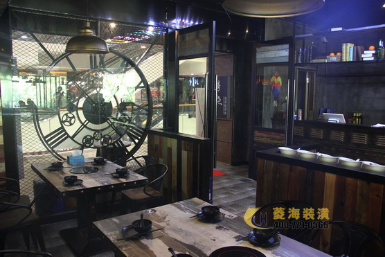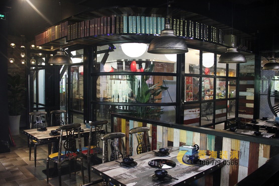 “撈魚(yú)”的設(shè)計(jì)特點(diǎn)是設(shè)計(jì)師運(yùn)用了截然不同的多種裝飾手法進(jìn)行混搭,在商業(yè)環(huán)境下?tīng)I(yíng)造舒適的用餐氛圍。餐廳裝飾的元素多而不亂,和諧統(tǒng)一,以工業(yè)鋼材、水泥肌理與玻璃墻面為框架,搭配花式鐵藝的手法在墻面勾勒出一幅機(jī)械鐘表的盤(pán)面進(jìn)行裝飾,在整個(gè)商城樓面內(nèi)十分搶眼。餐廳內(nèi)部,設(shè)計(jì)師運(yùn)用了大量色彩斑駁的廢棄老木材、青磚等元素造型打造墻面與隔斷,結(jié)合室內(nèi)植物造景、復(fù)古餐桌椅的軟裝飾點(diǎn)綴,充滿(mǎn)了強(qiáng)烈的懷舊感。位于門(mén)頭的屋檐設(shè)計(jì)也是一大亮點(diǎn),隔層空間擺滿(mǎn)年代感久遠(yuǎn)的裝飾品、精裝古典書(shū)籍等,古樸的生活氣息十分親民,也頗具觀賞性。