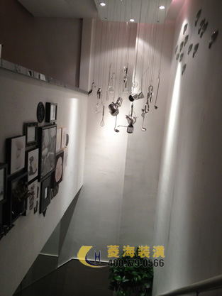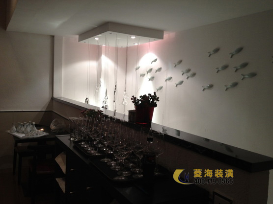 通往二樓的樓梯墻上貼著大大小小的相框,抬起頭則能看到掛著不同廚具模樣的銀質(zhì)吊飾,可見設(shè)計(jì)師在細(xì)節(jié)上下足了功夫,將店面打造得小巧而精致。二樓空間相對(duì)寬敞:柔和的燈光,排列整齊的高腳杯,現(xiàn)代風(fēng)格的壁畫……可能你已經(jīng)發(fā)現(xiàn),柒壽司不同于傳統(tǒng)日式料理店,老板馬先生會(huì)告訴你,沒錯(cuò),因?yàn)槠鈮鬯咀龅氖乾F(xiàn)代法式壽司。好奇的話,不妨親自去店里嘗嘗美食,看看我們的設(shè)計(jì)吧。